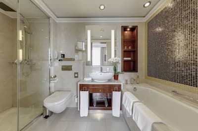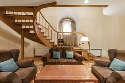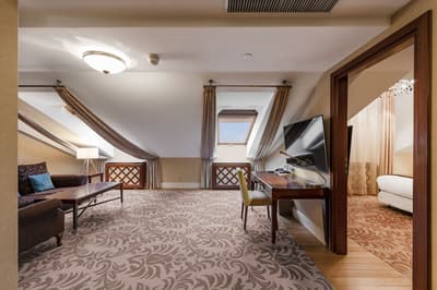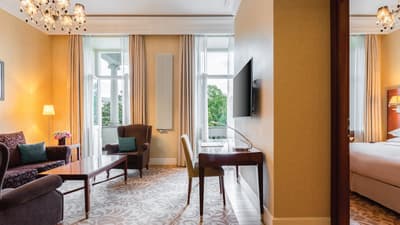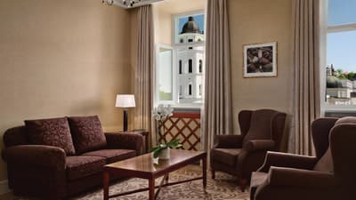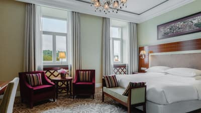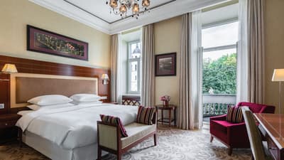 Le top ! Cette belle suite est d’un confort absolu. La grande fenêtre profite d’une vue reposante sur la ville. Très confortable, elle accommode un grand lit king. Petit salon avec canapé et fauteuils. Salle de bain avec douche.