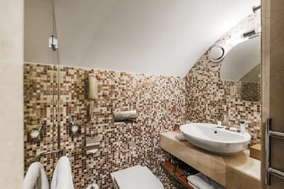 Elle baigne dans un style victorien et élégant. Grâce à ses murs et son carrelage de couleur clairs, elle est lumineuse et accueillante. Quelques touches de couleurs y ajoutent du peps.