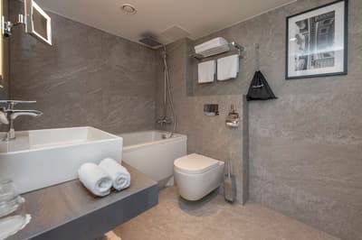 Articles de toilette, Baignoire, TV à écran plat, Réfrigérateur, Coffre-fort dans la chambre, Miroir grossissant, Sèche-cheveux professionnel, Wifi gratuit, Climatisation individuelle des pièces, Peignoir et pantoufles, Fer et planche à repasser.