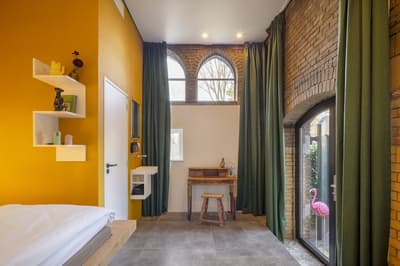 Hôtel, auberge de jeunesse, bar-resto branché, galerie d'art actuel, cowork : l'insolite Bunk Hotel fait tout ! Et surtout, il vous fait dormir sous la voûte d'une authentique église.