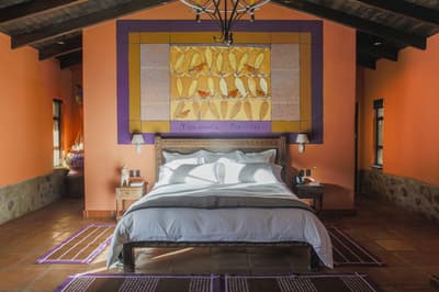 Elle profite d'un plafond voûté, de peintures murales ornées d'anges et d'animaux du Pérou assorties à des textiles tissés à la main issus des riches traditions de tissage de Cusco. Un large hall d'entrée sépare le salon accueillant d'un côté et la gracieuse chambre principale de l'autre. La salle de bains en marbre est équipée d’un double vasque et de toutes les commodités nécessaires. Le tout dans une atmosphère chaleureuse !