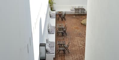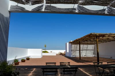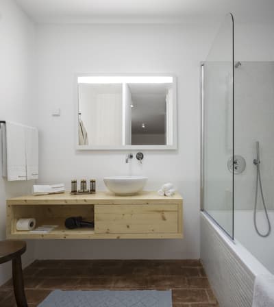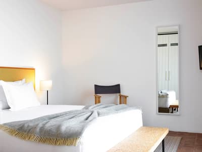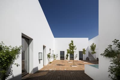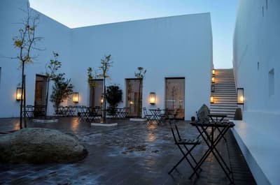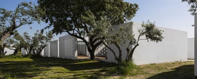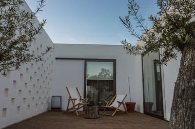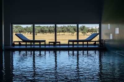 Dans ce paysage de chênes-lièges, de chênes verts et de végétation indigène, l'Ecork Hotel est la destination idéale pour qui recherche une expérience sensorielle associée au confort, aux saveurs et aux couleurs de l'Alentejo. Situé à quelques km d'Evora, votre hôtel a été le premier établissement durable certifié du Portugal. Organisées autour du bâtiment principal, les Suites, à l'image d'unités cubiques, toutes blanches, donnent au site un côté presque futuriste, d'autant plus lorsqu'on découvre le voisinage : de gentils moutons ! En arrivant à la réception, vous serez invités à remplir les formalités d'usage autour d'une table circulaire. Et pour vous souhaiter la bienvenue, une bouteille de vin vous sera offerte. Ici, on aime les bonnes choses ! Un accueil soigné ne peut augurer que de belles surprises... Des espaces communs d'une clareté et d'un charme insoupçonné, un équilibre esthétique entre sobriété et typicité locale. Ces luminaires façon panier, ces cheminée contemporaines, ces chaises tendues de cuir tanné, ces objets d'antan et ces arbres stylisés aux murs, séduisent. Quant à la piscine et son solarium, l'espace est fantastique...