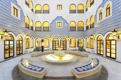 A peine arrivé, vous êtes bluffé par le lobby, tout en marbre clair, boiseries et fenêtres à moucharabiehs. N’hésitez pas à prolonger la visite jusqu’au patio carrelé d'azulejos jaunes et bleus, où une banquette encercle une ravissante fontaine. Celle-ci s’illumine le soir venu. Puis, baladez-vous dans le parc au gazon digne du green du golf qui fait le tour du domaine. Un parcours de 9 trous, où pour atteindre le dernier, le « Devils Parlour », votre balle doit passer par-dessus la falaise : bonne chance ! Plus loin, en suivant les allées de galets colorés, faites votre repérage de bars, restos, terrasses avec points de vue, dont celle perchée au sommet de la falaise. En contrebas : la plage. Vous y accédez par un ascenseur et un escalier : le panorama est sublime et la baignade revigorante. Si vous préférez les eaux plus chaudes pour plonger, nager, direction le spa, où l’on va aussi vous chouchouter entre massage aux pierres chaudes et soins ayurvédiques. Enfin, vous allez aimer le coucher du soleil face à la mer, avec un verre de poncha ou de porto pour démarrer la soirée. Une soirée à prolonger au-delà du dîner, le temps d’un concert en « live ». Bref, prévenez vos « followers », car vous allez en faire des « posts » depuis Albufeira !