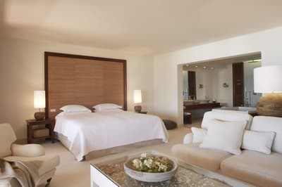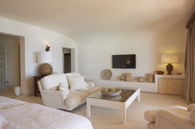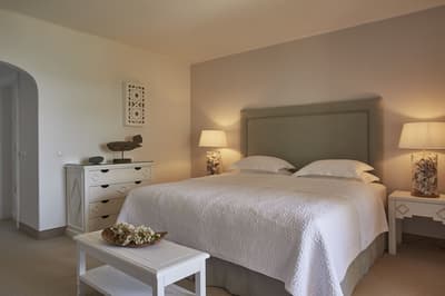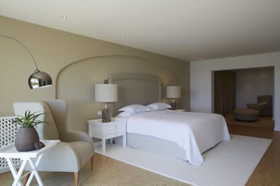 Cette chambre principale peut être située au rez-de-chaussée ou au premier étage et peut offrir une vue sur la mer. Elle peut également comprendre un coin salon extérieur avec transat ou un petit balcon avec coin salon.