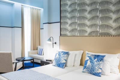 Le top ! Cette belle suite procure espace et confort. De ses grandes fenêtres, elle profite d’une vue reposante sur la ville ou sur la cour. L’atmosphère est calme et sereine. Très spacieuse, son coin salon est meublé d’un canapé-lit et de beaux fauteuils. Elle accommode un très grand lit. Salle de bain chic.