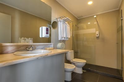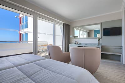 Cette belle chambre a tout le nécessaire pour un séjour confortable et agréable. Le balcon est aménagé de belles chaises pour apprécier la vue merveilleuse sur l’océan turquoise. Elle accommode un grand lit et dispose de beaux fauteuils dans un coin de la pièce. Salle de bain chic.