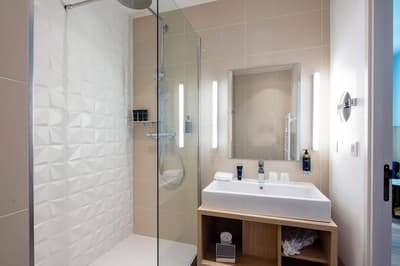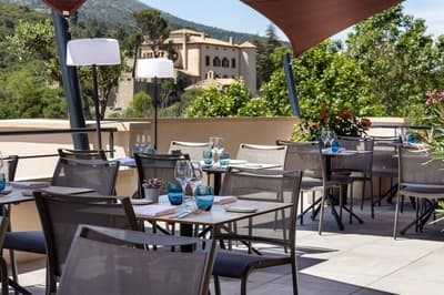 Vous êtes au cœur du chic et du charme de l’arrière-pays aixois. Vous poussez la porte d’une belle adresse, un brin confidentielle, inspirée des mas provençaux. Dès le lobby, mur de pierre, bois foncé et lumière naturelle donnent le ton de cet hôtel au luxe discret. Suivez les rayons du soleil jusqu’à la terrasse XXL ! Elle offre un panorama époustouflant sur la montagne Sainte-Victoire et le château de Vaunevargues, où a vécu Picasso. Même scénario dans votre chambre, dont le balcon ou la terrasse vous projette dans cette nature à l’état pur. Le calme, le silence : inspirez, expirez ! Au resto gastronomique, votre table s’oriente, elle aussi, vers le décor. Puis il y a la piscine, le bon spot pour se rafraîchir en plein été. Ce long couloir de nage fait face également à la Sainte-Victoire. Ce qui amplifie la sensation d’évasion et la déconnexion. Le meilleur moment ? Sans aucun doute la fin de journée, lorsque la montagne se pare de rose, telle une robe de soirée qu’elle enfilerait… Vous pouvez alors trinquer à sa santé, avec un verre de coteaux d'Aix !