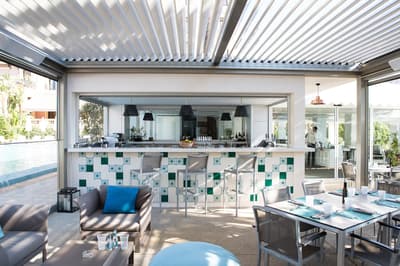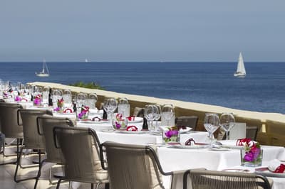 Hôtel inspiré par les villas de la Grèce antique, face à la Méditerranée, avec grill, table gastronomique, piscine, plage privée et centre de bien-être.