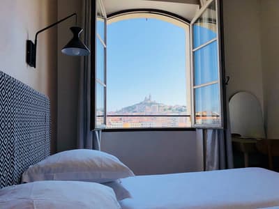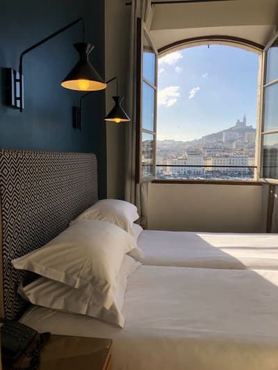 Le meilleur balcon de Marseille ! Depuis votre chambre au Belle-Vue, très cozy avec sa déco vintage-chic, tout le vieux-port est à vos pieds. Accoudé à la fenêtre en alcôve, vous regardez le soleil faire briller les flots et les dos des merlans du marché aux poissons — the place to be pour remplir son cabas le dimanche matin ! Sauf qu’ici, c’est Ogil qui cuisine (super bien). Descendez les marches en velours rouge de l’escalier 1900, fierté de ce petit hôtel jaune pâle à la façade typique : en attendant les moules farcies (ou les sardines, ou l’aïoli, on n'impose rien), c’est l’heure du sacro-saint pastaga sur la terrasse du bar-resto — un vrai hotspot à Marseille, cet ancien repaire de marins, avec son plafond bleu Méditerranée couvant des maquettes de bateaux. Encore une ou deux pics pour narguer les réseaux, puis un ou deux coups de coude pour conquérir une chaise, et vous voilà verre à la main, en train d’espionner les rumeurs en savourant l'accent local. C'est qu'il y a plus de Marseillais que de touristes, ici ! Profitez-en pour glaner leurs tips avant de faire vos plans pour l’après-midi. Sortie mer, city trip (sans voiture, hein : l'hôtel a le label Green Key, n'allez pas vous faire mal voir), y a du boulot… En rentrant, vous aurez bien mérité l’apéro-tapas et les cocktails inspirés de Viviane et Maxim. Trop claqué pour vous attarder ? Remontez l’escalier 1900 et rouvrez un peu la fenêtre avant de sombrer : depuis votre chambre au Belle-Vue, les bars du vieux-port s'enfièvrent (vous soutenez l’OM, au fait, pas d'embrouilles). Marseille by night, vous y êtes...