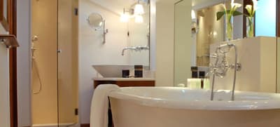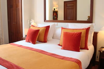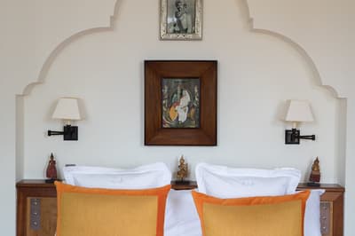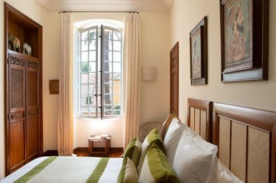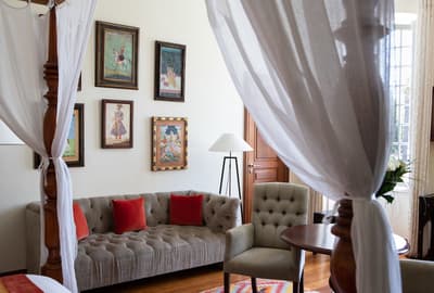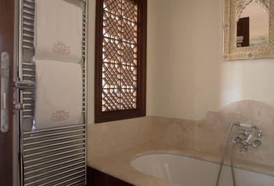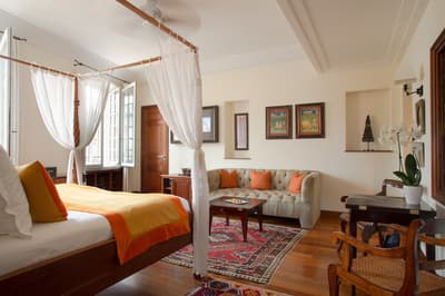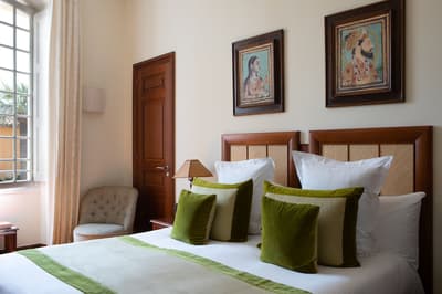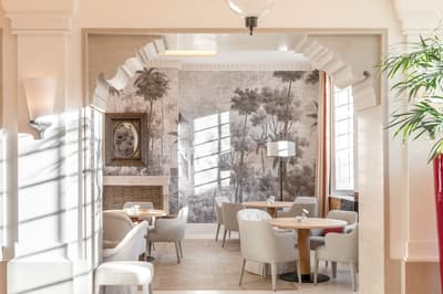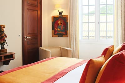Vis ma vie de princesse indienne ! Non, c'est pas le nom d'une nouvelle superproduction indo-tropézienne, mais on n'en est pas loin... Pan Deï Palais, c'est la maison qu'a bâtie le général Allard pour sa bien-aimée, la princesse indienne Pan Deï. C'est donc ici qu'a vécu la princesse, entourée de sa petite tribu de cinq enfants. Et en voyant la façade ocre et les fenêtres à petits carreaux de cet hôtel 5*, vous êtes loin d'imaginer que vous allez séjourner dans un décor oriental colonial totalement assumé, au style parfaitement maîtrisé ! Les meubles en bois sombre, les panneaux sculptés, les tapis, les objets, les couleurs chaudes... Et cette fresque murale dans la salle de resto ! Chacune des chambres porte le nom d'une divinité indienne — des chambres avec vue, sur Saint-Tropez ou sur le jardin. Dans le jardin justement, la piscine chauffée comblera vos désirs de fraîcheur et d'exotisme. Et charmante surprise : le fond de cette piscine est amovible pour donner naissance à une terrasse ! Sinon, la frontière entre Inde et St-Trop' est ténue, et si la plage privée Jardin Tropézina vous rappelle que vous êtes bien sur la Côte d'Azur, le décor et l'atmosphère (le personnel revêt un costume indien) vous feront vous sentir beaucoup plus loin... À tel point que le bruit de la balayeuse au petit matin et l'agitation de la Place des Lices, toute proche, vous feront presque croire que vous êtes à Delhi ou Bombay...
