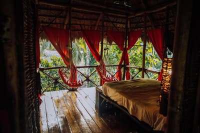 La cabane classique dans les arbres offre une vue imprenable sur la jungle car elle repose au-dessus de la canopée. Elle dispose d'un lit queen-size confortable, drapé d'une moustiquaire pour assurer un repos paisible après une longue journée d'activités. Pour votre intimité, chaque cabane dans les arbres a des rideaux et un mur arrière entièrement fabriqué à partir de vignes de la jungle tissées à la main.