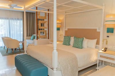 Entourée de jardins tropicaux, elle profite d’une atmosphère sereine et calme. Agréable et très confortable, elle dispose d’une petite terrasse aménagée de belles chaises et d’une table. Elle accommode 1 lit King et 2 lits doubles. Coin salon avec fauteuils et table. Grande salle de bain avec baignoire d’hydromassage.