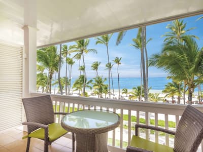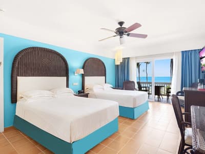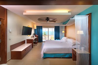 Cette belle chambre profite d’une magnifique vue frontale sur l’océan. Elle offre un cadre idyllique pour se détendre et apprécier le climat tropical. Son espace extérieur est aménagé de belles chaises et d’une table. Elle peut accommoder 1 lit King ou 2 lits doubles. Petit coin salon en chambre avec de beaux fauteuils. Salle de bain spacieuse et chic avec baignoire.