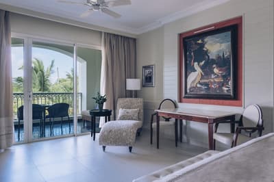 Située à l’étage, cette belle suite offre une vue magnifique sur la mer caribéenne. Son balcon est aménagé de chaises, d’une banquette et d’une petite table idéale pour apprécier le climat tropical. C’est un vrai nid douillet ! Elle accommode 1 lit King ou 2 lits doubles. Petit coin salon en chambre avec fauteuils. Salle de bain spacieuse avec baignoire à hydromassage bénéficiant également de la vue.