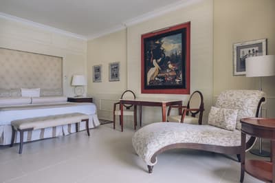 Entourée par les jardins de l’hôtel, elle baigne dans une atmosphère calme et sereine. C’est un petit nid douillet. Son balcon aménagé de chaises, d’une banquette et d’une petite table profite d’une belle vue sur la végétation luxuriante. Petit coin salon en chambre avec fauteuils. Elle accommode 1 lit King ou 2 lits doubles. Salle de bain spacieuse avec une baignoire à hydromassage bénéficiant également de la vue.