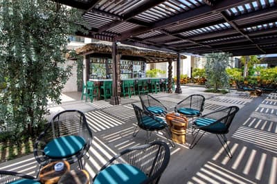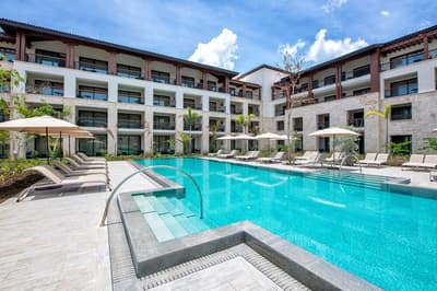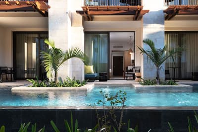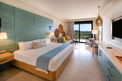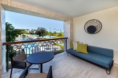 De sa terrasse ou de son balcon, elle profite d’une vue apaisante sur la piscine de l’hôtel. Son espace extérieur offre de belles chaises confortables pour apprécier le climat tropical. Elle peut accueillir 1 lit King ou 2 lits doubles et dispose d’un petit coin salon meublé de beaux fauteuils. Salle de bain chic avec douche à effet de pluie.