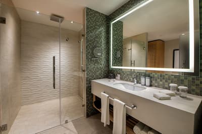 C’est un ensemble simple et à la fois élégant. Elle est moderne et baigne dans un style épuré et contemporain. Ses murs et son carrelage clairs rendent la pièce lumineuse. C’est un mélange de verre, de rotin et de bois contribuant à l’exotisme de la suite. Quelques touches de couleur donnent du peps à l’ensemble.