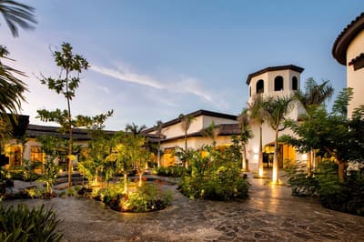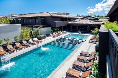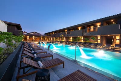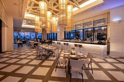 La lumière du soleil levant sublime le sable blanc et les 110 000 m2 de jardins. Les bâtiments forment autant d'habitations que celles d'un immense village. La piscine principale telle une vague léchant la plage, fait face à l'océan. Cabanas, transats, hamacs à bascule et salons de jardin design se partagent pontons et terrasses, à l'ombre des palmiers. Le resort oscille entre l'esthétique contemporaine et l'ultra-design. Ce dernier est exacerbé dans le quartier réservé exclusivement aux adultes : splendide ! Les volumes permettent l'installation de luminaires monumentaux extraordinaires, créateurs d'ambiance. Les matériaux, bois, béton ciré, ardoise, marbre et cuir, appellent des teintes naturelles. C'est à l'Inari que le rouge fait son apparition, au glacier que le mobilier prend des couleurs acidulées et au Teatro que la meneuse de revue et ses danseuses revêtent des costumes flamboyants. Cadre, ambiance, luxe décontracté, tout y est...