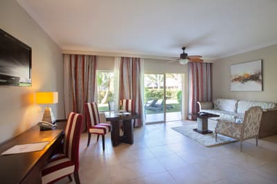 L’intérieur bénéficie d’une décoration plutôt élégante et comprend un lit king-size ou deux lits doubles, un coin salon séparé de la pièce principale, un mobilier contemporain et l’ensemble est dans des tons clairs. La salle de bain est dotée d'un double vasque et d'une douche à l'italienne séparée. Le tout dans une atmosphère chic et tropicale à la fois !