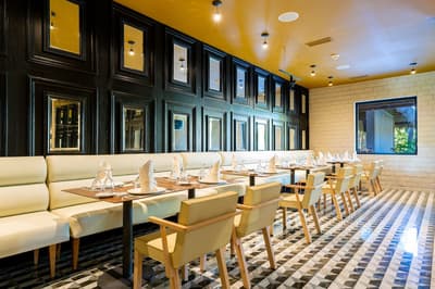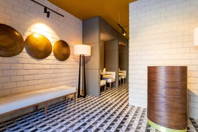 Le décor est élégant et raffiné, avec un beau carrelage, des touches de bois noir, un canapé bordeaux et des luminaires design. À noter que la baignoire et la douche sont séparées. Une très belle ambiance de vacances chic !