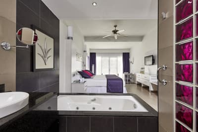 Elle comprend un lit super king-size (200 x 200 cm), un beau carrelage, un mobilier design, le tout dans une dominance de blanc. Le coin salon dispose d’un canapé confortable et la salle de bains est dotée d’une baignoire d'hydromassage et d’un double vasque. Le tout dans une atmosphère tropicale et chic à la fois !