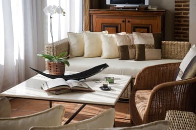 Décorée dans un mélange de style contemporain et colonial, cette suite possède du carrelage couleur brique au sol. Le lit est de grande taille et est à baldaquin ou avec des rideaux blancs tout autour. Le mur derrière le lit est fait en grosses pierres, deux lampes y sont accrochées de part et d'autre. Une grande armoire en bois sombre, un bureau, deux fauteuils et une petite table complètent l'ensemble. Dans le salon, les couleurs sont plus vives : grand miroir jaune et tableau multicolore au mur, fauteuils blancs avec coussins de toutes les couleurs, tapis de style oriental...