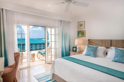 Superbe ! La terrasse est aménagée de beaux fauteuils pour apprécier la vue sur l’eau cristalline. Très spacieuse, elle accommode un grand lit king et le salon est meublé de beaux fauteuils. Salle de bain avec douche et baignoire.