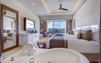 Elle bénéficie d’une décoration contemporaine et soignée avec un beau carrelage, un mobilier luxueux et se complète dans des tons blancs vifs. La chambre est dotée d’un lit King ou 2 lits Queen DreamBed™ haut de gamme avec des draps à haute teneur en fils et la salle de bains est équipée d’une douche à effet pluie Royalton Signature ou d’une baignoire jacuzzi. Si vous voyagez avec des compagnons, le canapé gigogne est parfait. Le tout dans une ambiance relaxante !