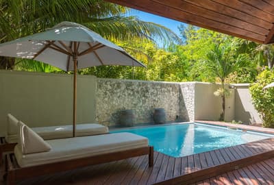 L’ensemble est dans un style de décoration luxueuse et élégante avec un beau parquet ciré, des couleurs claires, un mobilier épuré et des tableaux à motifs tropicaux. La chambre comprend un lit king size à baldaquin et un grand salon intérieur pour des moments de détente. La salle de bains attenante est équipée d’une baignoire et s’ouvre sur une cour privée avec une douche séparée. Le tout dans une atmosphère tropicale et de détente !
