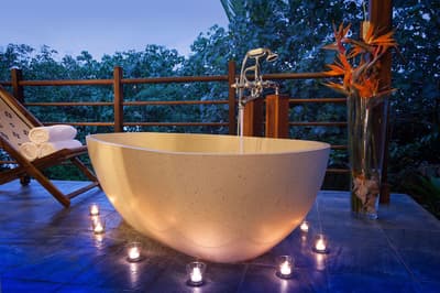 Cette magnifique villa profite d’une terrasse extérieure séparée d’où vous pourrez profiter de la vue pittoresque bordée d'arbres de l'autre côté du chenal jusqu'à l'île Sainte-Anne, tout en prenant vos repas et profitant du soleil. La salle de bains extérieure est équipée d’une baignoire autonome, d’une douche à effet pluie et d'un petit jardin paysager; idéale pour ceux qui souhaitent de l'intimité et un long bain apaisant en plein air au milieu de la canopée tropicale.