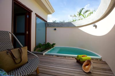 Superbe ! Installée parmi les jardins verdoyants, elle profite d’un cadre merveilleux. Petite terrasse disposant d’une piscine et de belles chaises. Elle accommode un grand lit. Salle de bain chic.