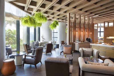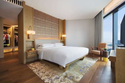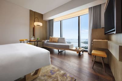 Envie d’un séjour qui mélange luxe raffiné et ambiance décontractée ? L’Andaz Singapour est parfait ! Ce 5 étoiles aux prestations stylées ne ressemble à aucun autre. Côté immersion, vous êtes plongé dans la mosaïque culturelle de la cité-état. A proximité de la baie, à vous la découverte du riche patrimoine indien, musulman ou malais. Le quartier est top pour arpenter les artères fréquentées de Bugis Street ou d’Haji Lane ! L’hôtel est installé dans l’une des tours de l’époustouflant gratte-ciel Duo, une réalisation architecturale monumentale signée Ole Scheeren. S’il vous faut monter au 25e étage pour atteindre le lobby, vous êtes superbement accueilli. Enregistrement attentionné et rafraichissements gratuits. Le design intérieur est un mélange étonnant entre style moderne et cosy. Omniprésence de bois, sièges confortables et végétation en suspension. Les sols en marbre sont réchauffés par des tapis épais et des œuvres d’art ponctuent les espaces communs. Nichée dans un environnement luxuriant, la vaste piscine extérieure est géniale pour nager les yeux rivés sur la skyline de Singapour. Vous voulez manger local ? Ça tombe bien ! L’Andaz propose des cuisines savoureuses et variées dans ses 4 restaurants à l’esprit street food typique. Dans les belles chambres au design épuré, préparez-vous à l’effet whaou : les rideaux se lèvent automatiquement à votre arrivée et la vue sur la baie est tout simplement à tomber !