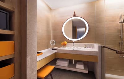 Superbe ! Cette belle chambre profite d’une vue superbe sur la ville vibrante. Agréable et confortable, elle accommode un grand lit king et dispose d’un canapé dans un coin de la pièce. Salle de bain avec douche à effet de pluie.