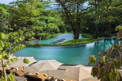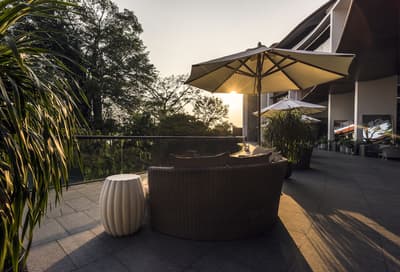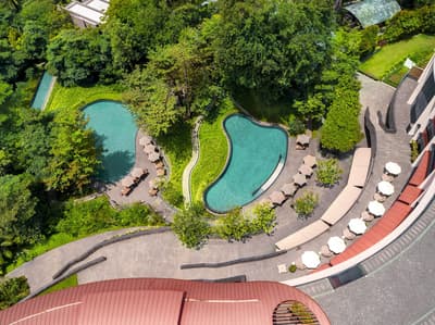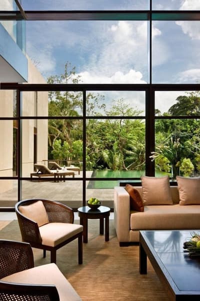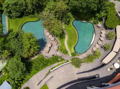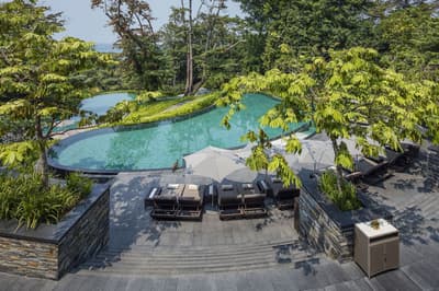 Vous voulez un endroit magique, hors du temps et de l’agitation touristique ? Le Capella Singapore est posé au sommet d’une colline sur l’île de Sentosa. L’endroit est prisé des célébrités qui apprécient son intimité. Tout autour, la végétation tropicale s’étend doucement jusqu’à la mer de Chine. Dans les jardins arborés, il n’est pas rare de croiser paons et perroquets. L’établissement compte parmi les plus prestigieux au monde. Il faut dire qu’il porte la patte de l’architecte Norman Foster. Pour créer cette résidence élégante, deux bâtiments coloniaux des années 1880 ont été rénovés. Des extensions au style plus futuriste ont été rajoutées pour accueillir 112 chambres au luxe raffiné. Situé dans l’un des bungalows classés, le salon-bibliothèque est un havre de paix. Mobilier cosy, tapis orientaux et parquet. Très chic pour bouquiner, prendre le thé ou même s’abriter le temps d’une averse tropicale. L’espace piscine est sublime avec ses 3 bassins étagés façon rizière. Le top ? Chiller sur votre transat bercé par le bruit de l’eau et le chant des oiseaux ! A proximité, le Bob’s bar est juste parfait pour siroter un cocktail en admirant le coucher du soleil. Les restaurants proposent cuisines cantonaise authentique et méditerranéennes classiques. A savourer sans modération avant d’aller vous dépenser dans la salle de gym suréquipée. Vous préférez vous ressourcer ? Niché dans la forêt, le spa Auriga mérite amplement ses 5 étoiles !