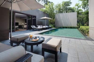 Pouvant accueillir une petite famille ou un groupe d’amis, elle est située sur tout le terrain et surplombe les jardins luxuriants et verdoyants. Elle profite d’une piscine privée de 3m x 3m pour nager de jour comme de nuit. Après vos activités, vous pourrez vous détendre dans les transats sur la terrasse extérieure, tout en profitant du soleil et prendre un bain rafraîchissant sous la douche à effet pluie extérieure.