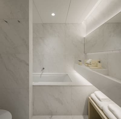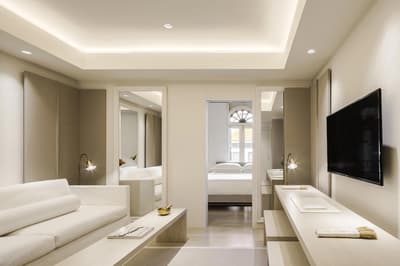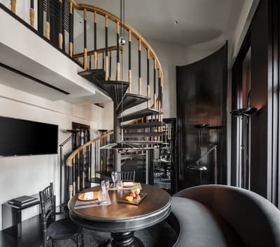 Spacieuse et confortable, elle est superbe ! Ses grandes fenêtres profitent d’une belle vue sur la ville vibrante. En duplex, la chambre est à l’étage et accueille un grand lit et le salon est meublé d’un canapé et de beaux fauteuils. Salle de bain avec douche à effet de pluie.