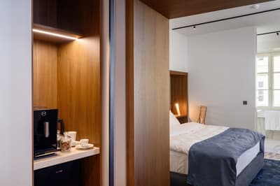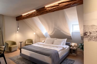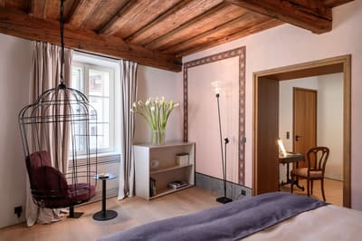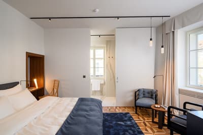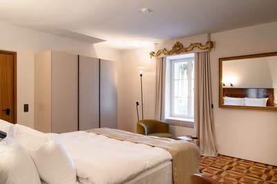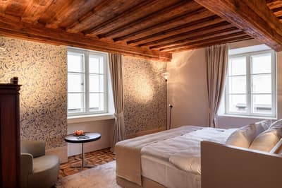Sans aucun doute, la chambre la plus poétique de l'hôtel ! Cette magnifique chambre est une reconstitution d'une fresque du XVIIe siècle et porte le nom d'une ballade du plus grand poète slovène, France Prešeren (1800-1849). Elle offre une vue splendide sur la rivière émeraude Ljubljanica, à l'endroit même où se déroule la fin dramatique de la balade et de l'autre côté, la vue s'ouvre sur le château de Ljubljana.