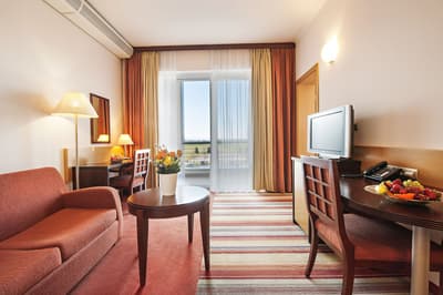Encore plus spacieuse, elle est très confortable et agréable. Le balcon complètement aménagé profite d’une vue reposante. Elle accommode un grand lit king et dispose d’un salon meublé. Salle de bain chic avec baignoire.