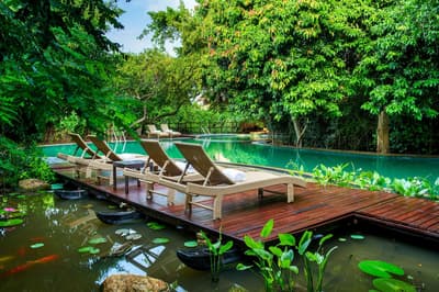 On parie que dès que vous aurez posé le pied là bas, vous l'aurez dans la tête… awimbowé awimbowé… bienvenue dans la jungle ! Le Jungle Beach hôtel porte bien son nom : l'hôtel vous propose de loger dans l'un des 49 châlets, tous équipés de balcons, dans la jungle, et en même temps à la plage. L'hôtel donne sur une plage où vous pourrez lézarder ou vous essayer à la plongée. La piscine vous donne cette impression d'être dans un lieu caché au milieu de la jungle. Les matériaux utilisés (bois, chaume...) rendent l'expérience unique. Pour la vue, choisissez entre le lagon, la plage ou la jungle... trois ambiances à tester ! Vous serez au milieu de la nature (pensez à l'antimoustiques), en totale immersion. Côté nourriture, le petit-dej est au top, varié, frais et copieux. Du fait que l'hôtel est petit, le restaurant propose midi et soir une carte restreinte et bonne, avec produits du coin, cuisine locale et internationale. Vous pourrez aussi vous faire organiser un dîner privé en 5 services, en mode moi Tarzan, toi Jane (mais chic). Côté activités, plongée, spa et repos sont au programme. Il vous faudra chevaucher un tuk-tuk pour retourner à la civilisation, et réserver des excursions si vous souhaitez visiter le coin. L'hôtel possède également une petite salle de sport.