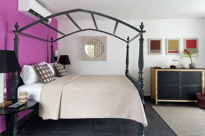 Élégante, elle arbore un beau carrelage, un mobilier moderne et se complète par des accessoires éclectiques. La chambre est dotée d’un lit à baldaquin antique et la salle de bains attenante spacieuse est bien équipée. Elle comprend un beau coin salon, séparé, meublé d'objets d'art et d'artefacts intéressants et d’une cuisine ouverte entièrement équipée pour préparer vos repas. Le tout dans une ambiance conviviale !