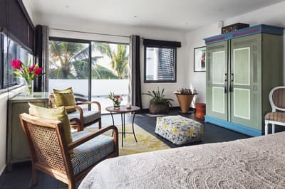 Située au deuxième étage, elle profite d’un balcon commun avec fauteuils d'où vous pourrez contempler la vue spectaculaire sur l'océan et une vue arrière sur des jardins verdoyants et luxuriants. À noter que la chambre peut devenir un grand espace avec des parties communes partagées et peut également être utilisée comme deux chambres doubles séparées.