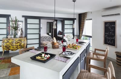 Élégante, elle arbore un beau carrelage, des intérieurs en peluche et un mobilier excentrique. La chambre est dotée d’un lit king size (convertible en lits jumeaux) et la grande salle de bains privée est bien équipée. Elle comprend également un salon confortable avec un second balcon et vous pourrez préparer vos repas dans la cuisine entièrement équipée. Le tout dans une ambiance conviviale !
