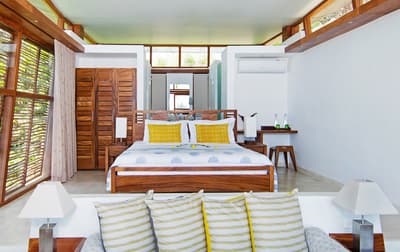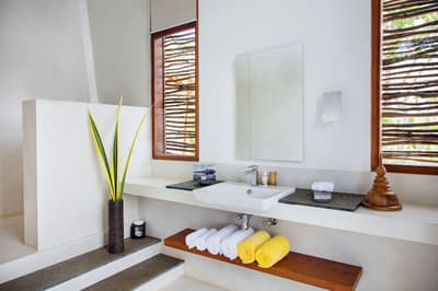Spacieuse, elle arbore un style contemporain avec un beau carrelage, un mobilier en bois clair et se complète dans une dominance de blanc. La chambre est dotée d’un lit king-size et d’un lit de repos pouvant accueillir une personne supplémentaire. La salle de bains attenante est équipée d'une baignoire ainsi que d'une grande douche à l'italienne à effet pluie. Le tout dans une ambiance zen !