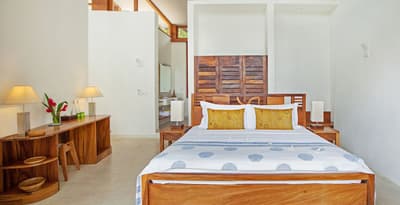 Aérée, l’ensemble est dans un style de décoration soigné et contemporain avec un beau carrelage, un mobilier en bois clair et se complète dans une dominance de blanc et d’accessoires exotiques. La chambre est dotée d’un lit king-size et d’un lit de repos qui est également un lit simple. La salle de bains attenante dispose d'une grande douche à l'italienne à effet pluie. Le tout dans une atmosphère conviviale !