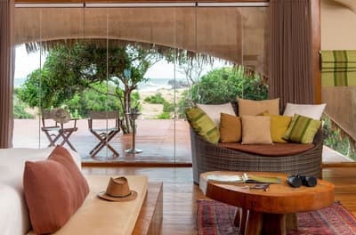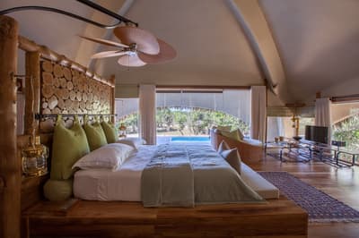 Bien aménagée, elle est conçue en harmonie avec ses environs sauvages et profite d’une architecture vernaculaire de la région. L’intérieur met subtilement en valeur les thèmes du safari, avec des meubles en rondins et des motifs rustiques de style africain qui démentent le confort des créatures ultra-modernes offerts à l'intérieur. La chambre est dotée d’un lit confortable et la salle de bains privée est équipée d’une baignoire autoportante et commandes de vanité doubles.