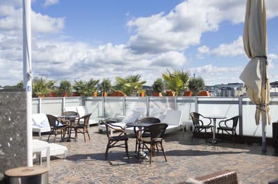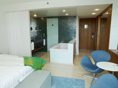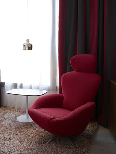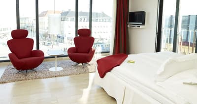 Depuis le Kungsportsplatsen, avant même de passer la porte vitrée de l'hôtel Avalon, levez-donc les yeux ! Il ne s'agit ni d'un aquarium, ni d'un seau d'eau farceur prêt à se déverser sur vous : c'est bel et bien une piscine. Et là, vous vous voyez déjà en maillot de bain, un cocktail à la main, à admirer la vue sur le centre-ville. De nuit, l'arrivée est encore plus impressionnante, quand le toit s'illumine avec de grandes lettres en néon rouge... Une fois entré, vous découvrez un bel espace en mezzanine qui collectionne les coins-salons. Vous y reconnaîtrez tout de suite les emblématiques fauteuils à oreilles du danois Arne Jacobsen, parmi d'autres chef-d’œuvres de design. Laissez-vous émerveiller par l'éclairage, les assos de couleurs et les petits détails de la déco : ils créent une atmosphère vraiment unique, urbaine et internationale. Certifiée Feng Shui, l'harmonie entre l'ameublement, la lumière, le parfum et le son joue aussi un rôle majeur. L'hôtel et ses 101 chambres ont été conçus pour vous donner un sentiment de convivialité en arrondissant les angles. Le plus bel exemple ? Le couloir du quatrième étage avec ses formes sinueuses. Vous remarquez aussi les eaux ondulantes de l'entrée qui, selon le Feng Shui, accueille à la fois les invités et la prospérité !