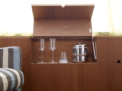 Classe et moderne, l’ensemble est élégant. Elle laisse pénétrer la lumière naturelle pour une pièce lumineuse et accueillante. Le mélange de bois, de verre et de métal rend harmonieuse. Quelques touches de couleurs lui donnent du peps.