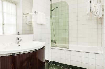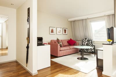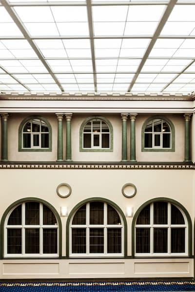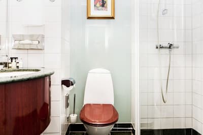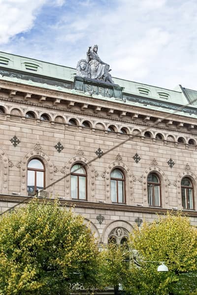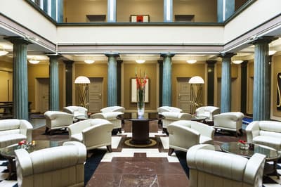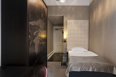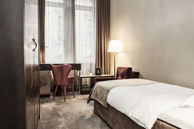 Dormir sous la protection de Svea, personnification de la nation suédoise, avec un bouclier d'un côté et des lions de l'autre — prêts à repousser tous ceux qui oseraient envahir sa chère patrie ! La princesse guerrière surplombe l'entrée de l'hôtel depuis l'époque où le bâtiment abritait les bureaux de la compagnie suédoise d'assurances Svea. Conçue pour vous impressionner, aucune dépense n'a été épargnée pour la façade massive et protectrice, ciselée de fenêtres cintrées. À l'intérieur, vous tombez sur des escaliers en marbre et sur des sols en terrazzo où se reflètent des lustres étincelants. Et la touche de modernité, dans tout ça ? Un mobilier design et des œuvres d'art audacieuses au rez-de-chaussée. Quant à l'atrium aux colonnes de marbre vert, il vous offre une perspective grandiose, en plus d'une source de lumière très appréciable pour son petit salon au sol en damier. Bref, voilà un ancien bureau de banque luxueux et discret, avec son impressionnant escalier de marbre bordé de colonnes écarlates et ses hauts plafonds lambrissés. Et surtout, c'est le lieu de résidence préféré des célébrités de passage à Göteborg. Chuuut...