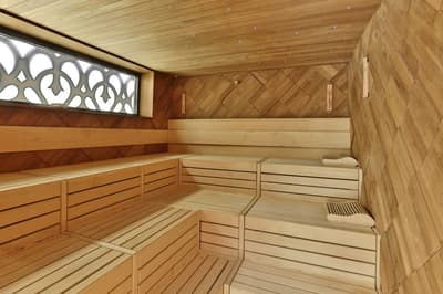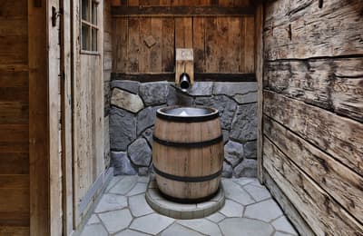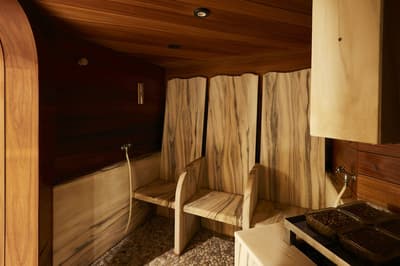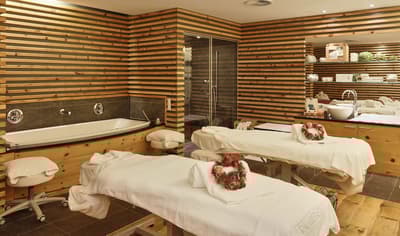 Un hôtel de luxe avec espace bien-être et piscine extérieure chauffée installé dans un grand chalet en bois.