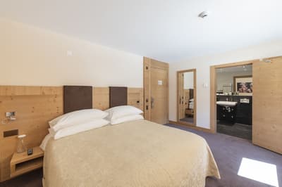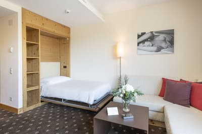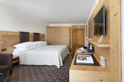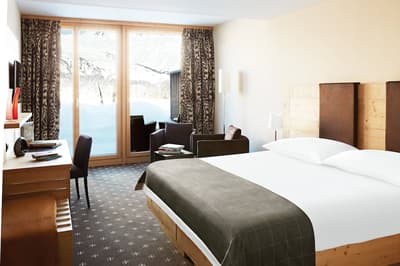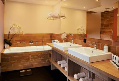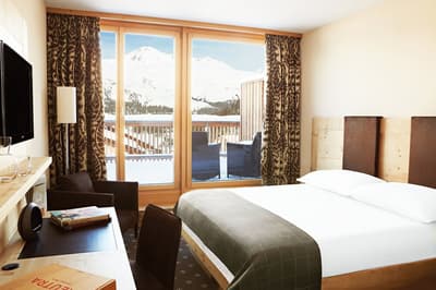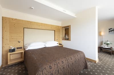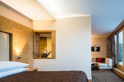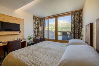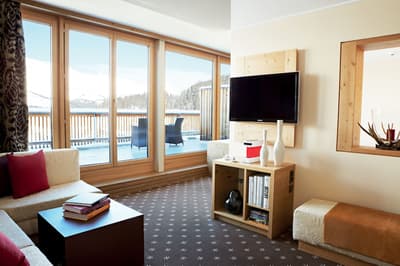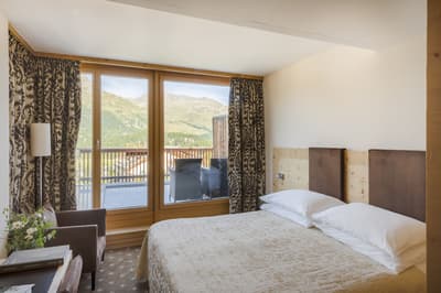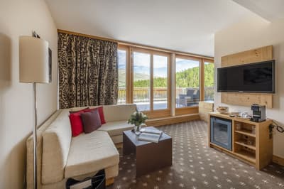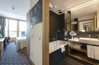 Superbe ! Cette belle suite est très spacieuse et purement confortable. D'une dimension généreuse, la balcon est complètement aménagé et profite d’une vue merveilleuse sur les montagnes. Elle accommode un grand lit et le salon est meublé de beaux fauteuils et d’un lit pliant. Salle de bain avec baignoire et douche.